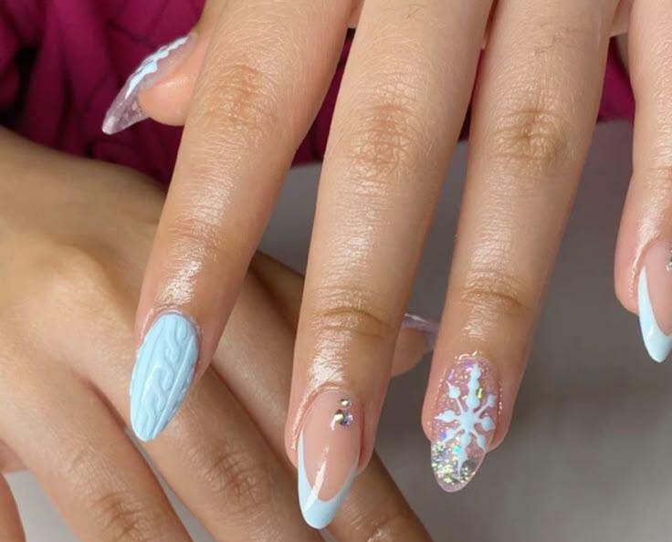 Soft baby-blue tones pair with delicate white snowflakes and a textured sweater-knit nail, creating a cute, January seasonal look that feels calm and wintry.