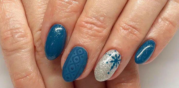 These nails combine rich teal polish with a cozy knitted-pattern accent and a silver glitter nail topped with a small snowflake. The mix of textures and cool tones creates a fun January, wintry look without being too busy.