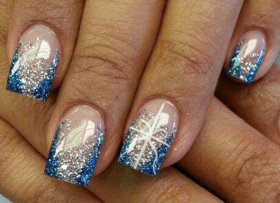 This set blends a nude base with bold blue and silver glitter tips, highlighted by a single white snowflake accent. The sharp gradient effect gives it a crisp, icy vibe that stands out while still staying simple January finish.