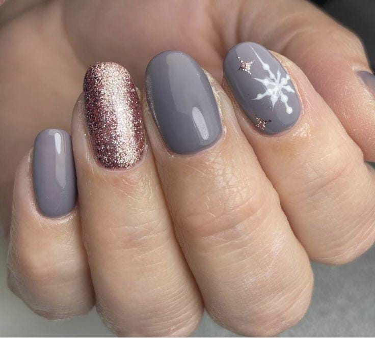 A chic mix of muted grey nails paired with a rose-gold glitter accent and a subtle snowflake detail creates a cozy-but-minimal winter January look. It feels elegant without being too bold.