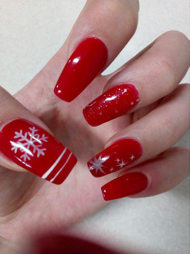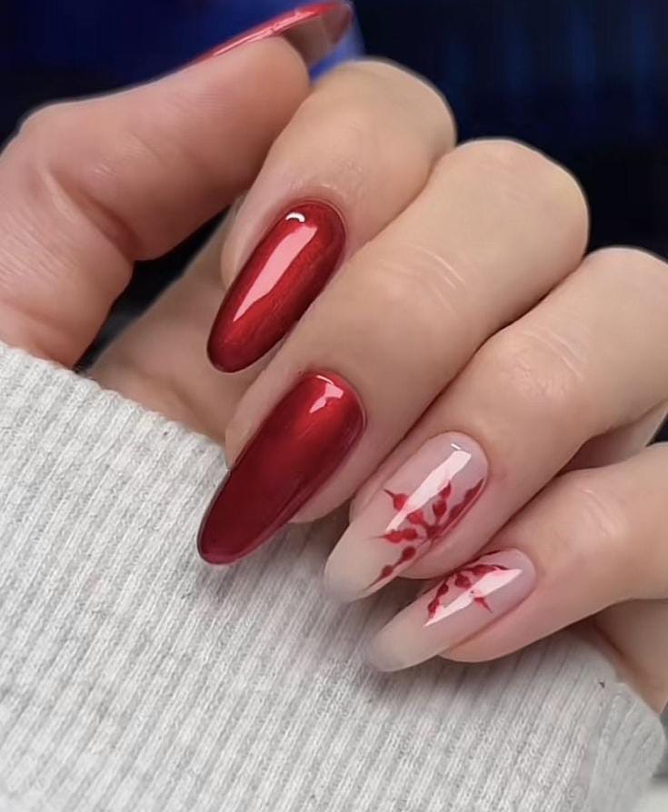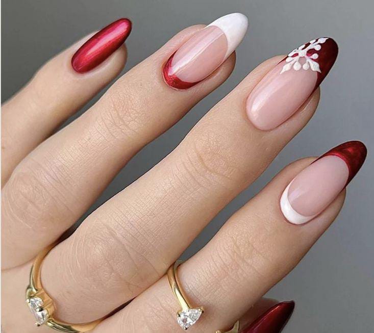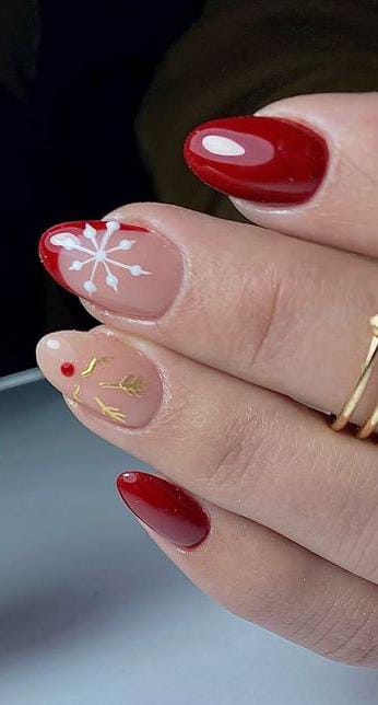 A mix of deep metallic red nails and nude ones with delicate red snowflake-like accents gives this look a warm, glowing winter vibe perfect for cozy Christmas nights.