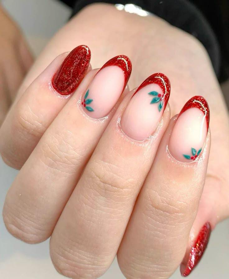 A nude base with glittery red French tips and tiny green holly leaf accents gives a subtle, elegant Christmas festive charm.
