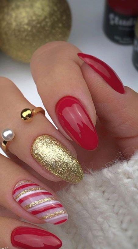 This design mixes glossy red nails with a sparkling gold accent and candy cane–inspired stripes, bringing together classic Christmas colors with a hint of glam.