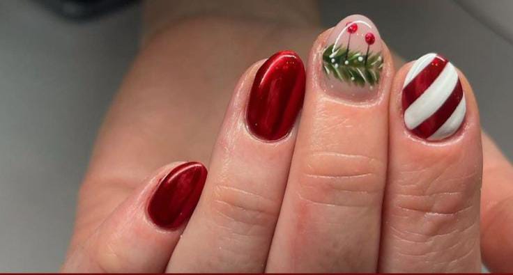 Shiny red nails paired with a white-and-red striped candy cane pattern and a sprig of festive greenery make for a fun, cheerful Christmas manicure.