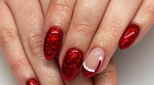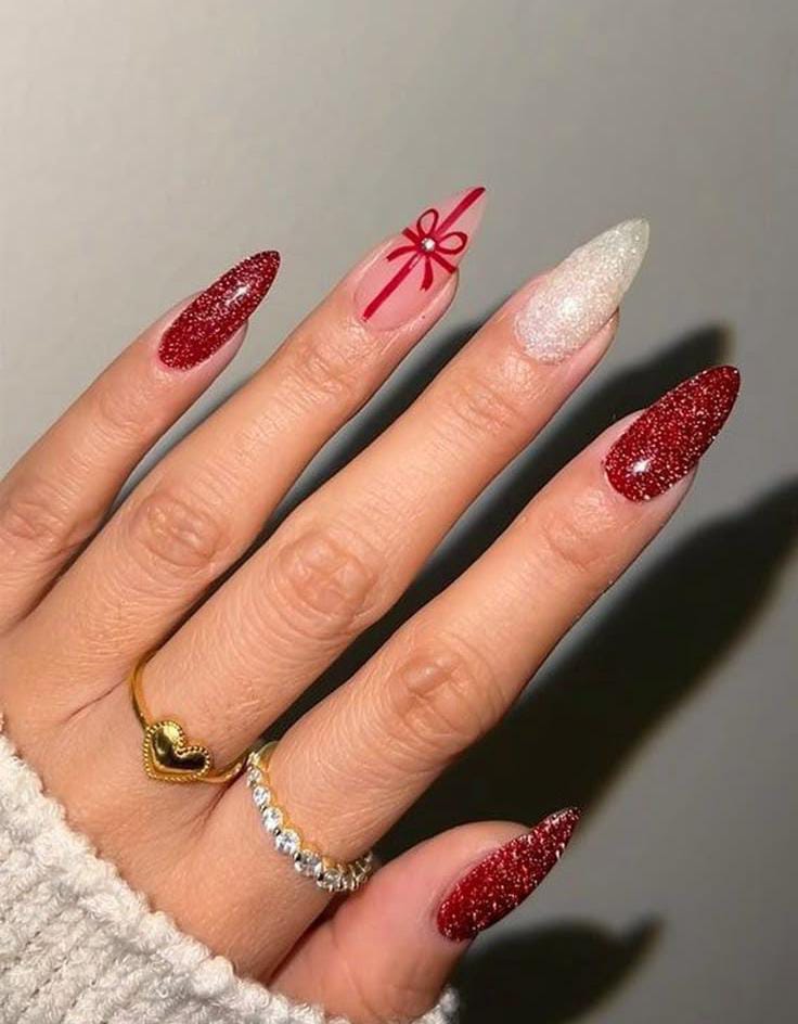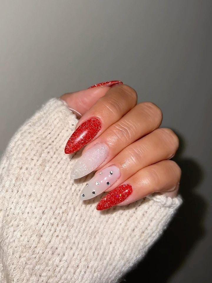 A stunning mix of deep red glitter nails paired with frosty white shimmer and a touch of crystal accents, creating a festive and elegant Christmas winter sparkle.