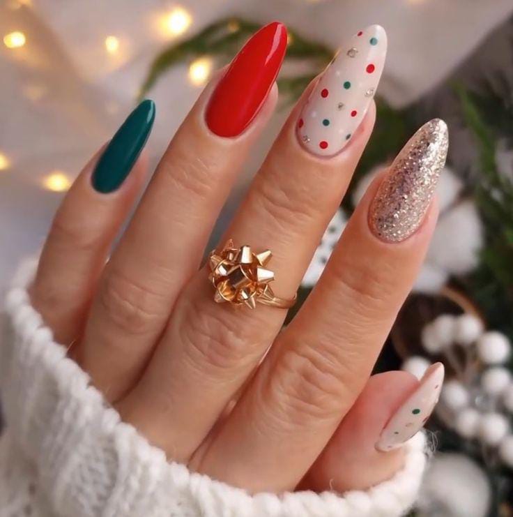 A fun, colorful mix of red, green, white, and gold glitter nails with playful polka dots that instantly bring a cheerful, Christmas holiday-party vibe.