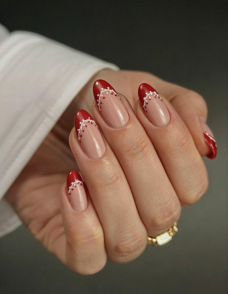 Elegant red French tips are paired with dainty white and red dotted accents over a soft nude base, creating a festive and classy Christmas holiday look that feels effortlessly chic.