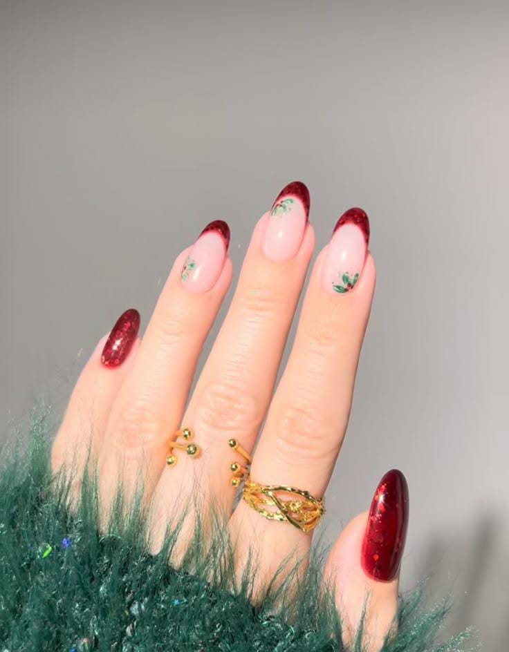 Soft nude nails with deep red glittery tips and tiny green holly leaf accents — a subtle, cozy design that perfectly captures Christmas elegance.