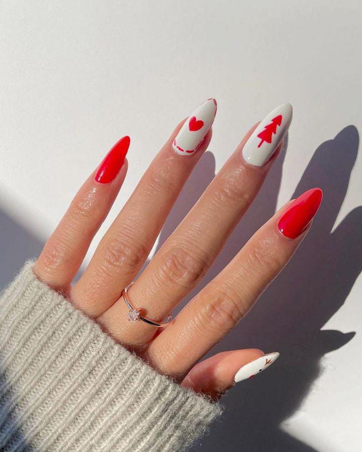 A charming mix of bright red and snowy white nails featuring simple Christmas icons like hearts and trees. It’s a minimal yet merry look that balances sweetness with holiday spirit.