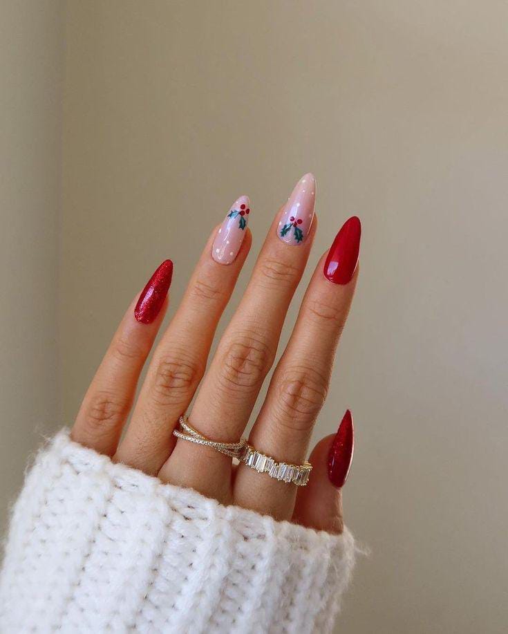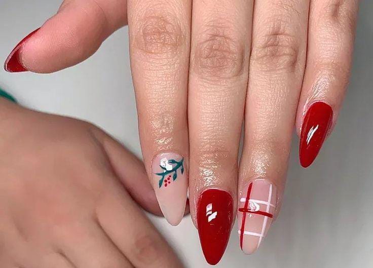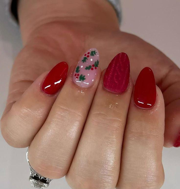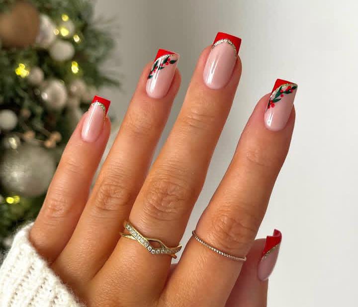Classic red nails are softened with nude tones and tiny holly leaf accents, creating a fresh, traditional Christmas vibe that feels both elegant and cheerful.