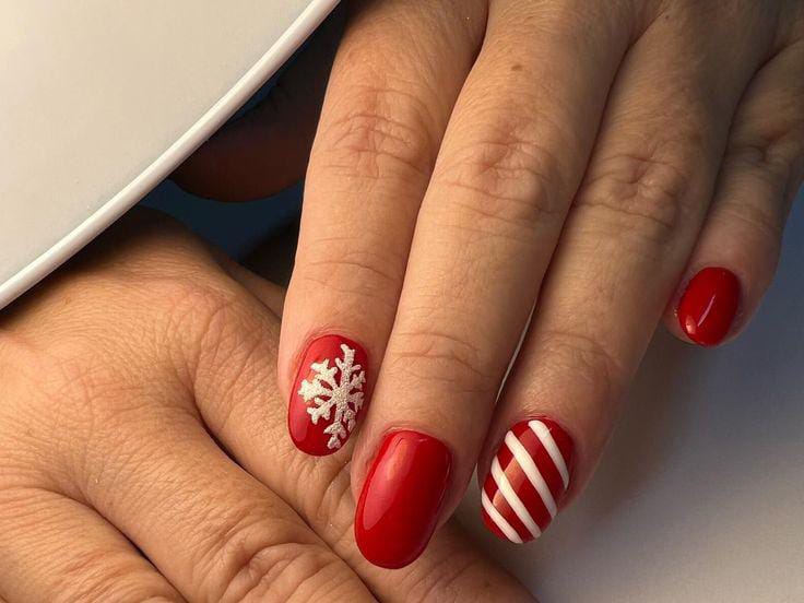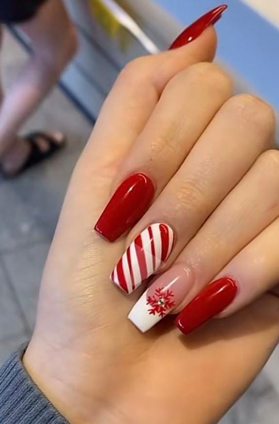 Bright red nails paired with a striped candy cane accent and a dainty snowflake bring a sweet and cheerful Christmas spirit. It’s simple, bold, and totally festive.