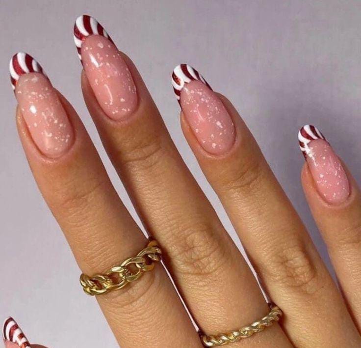 Soft nude-pink nails with red and white candy-striped French tips create a subtle, stylish nod to Christmas. It’s minimalist with just the right touch of holiday fun.