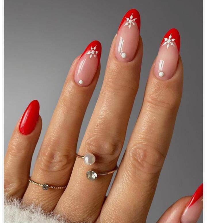 Soft nude bases with bright red French tips, finished with tiny white snowflakes and dots that give a subtle, charming Christmas feel.