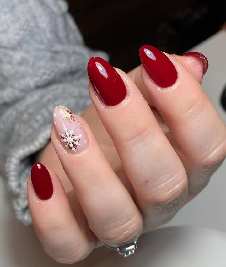 Rich, deep red nails balanced with a nude accent nail adorned with a gold foil, white snowflake pattern, adding a cozy yet refined Christmas holiday touch.