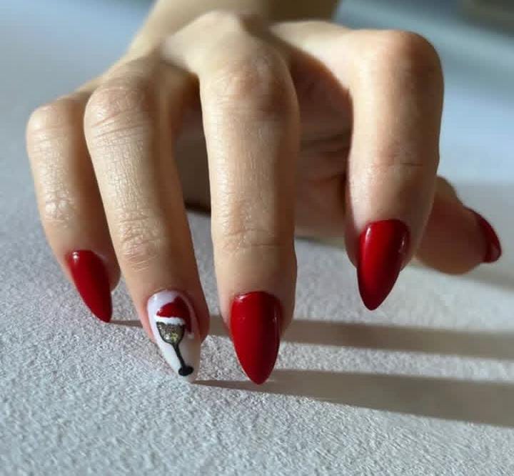 This design features deep red nails paired with an accent nail showing a festive glass of bubbly topped with a tiny Santa hat. It’s playful yet classy — perfect for Christmas and holiday parties.