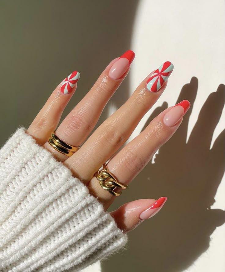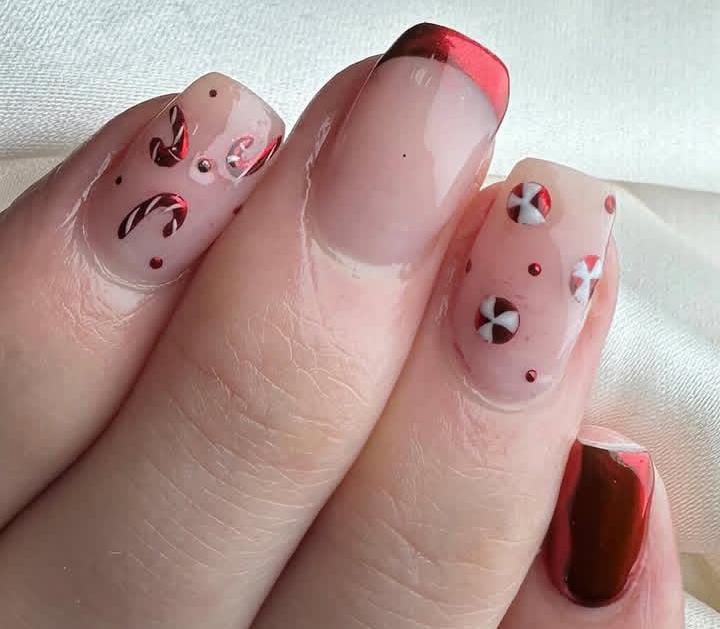 Soft nude nails are decorated with shiny red metallic accents, candy cane stripes, and peppermint swirl patterns. The look feels sweet, fun, and a Christmas look.