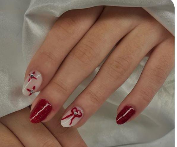 These nails mix red glitter and white polish with dainty red ribbon designs, mimicking beautifully wrapped Christmas presents. Simple but with just the right amount of sparkle.