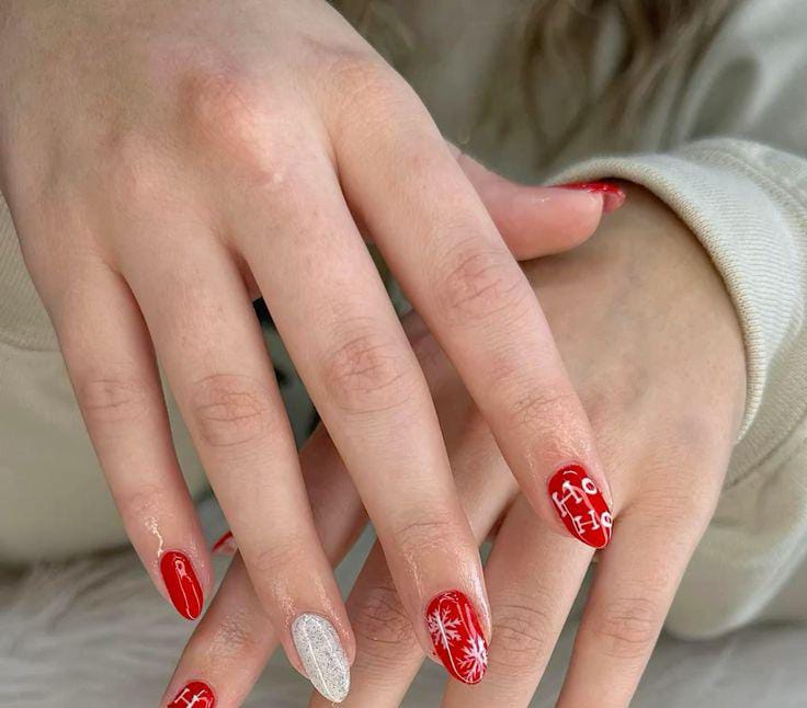 Bright red nails decorated with snowflakes, “Ho Ho Ho” lettering, and a touch of silver shimmer bring a joyful and merry Christmas energy to this simple, fun manicure.
