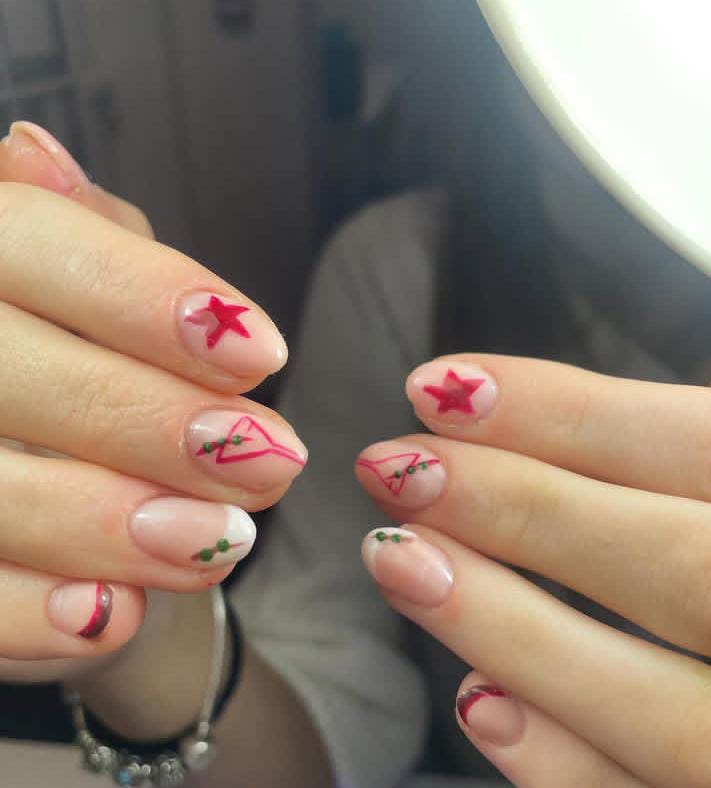 Minimal nude nails with small red stars and fine line art of Christmas trees create a cute, creative holiday vibe. It’s festive without being over the top — perfect for a simple Christmas look.