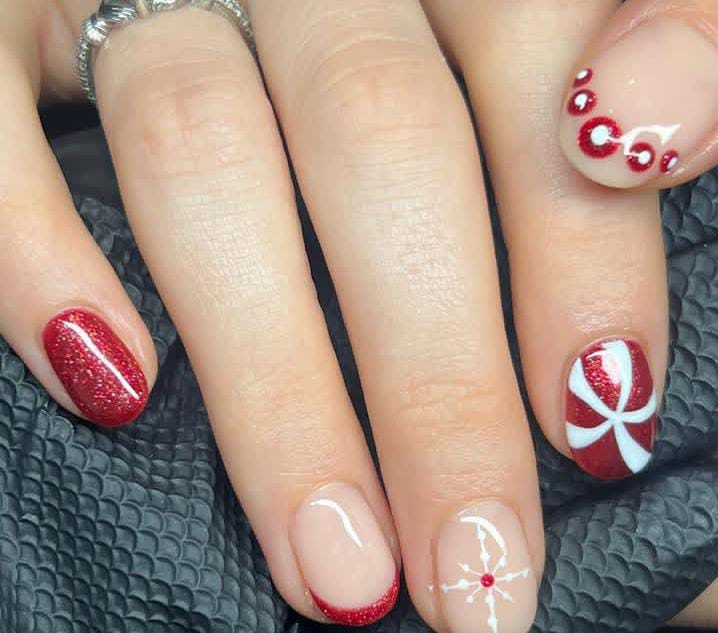 This design mixes deep red glitter polish with white swirls and dots on a nude base, giving a fun, candy-inspired Christmas vibe.