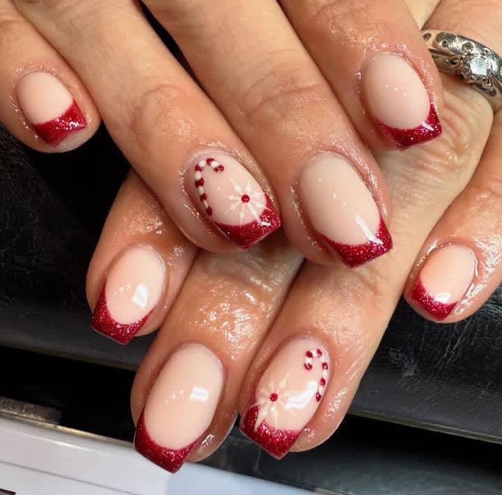 Classic French tips get a holiday twist with shimmering red glitter edges and delicate candy accents for a festive yet simple christmas look.
