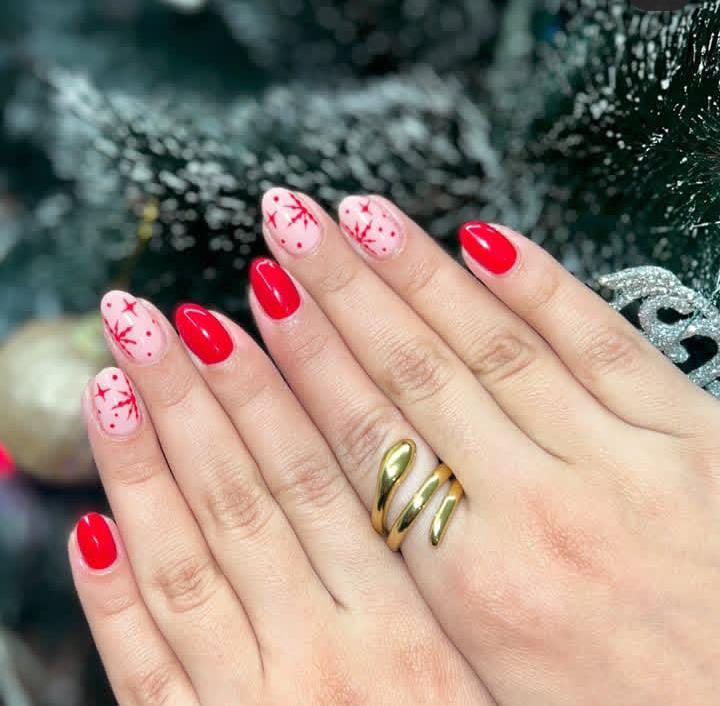 This look combines classic red nails with soft pink accents and delicate red snowflake patterns, giving a festive yet cozy winter vibe that feels merry Christmas and feminine.