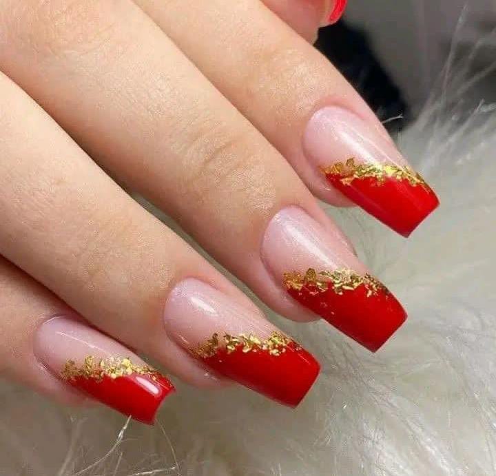 Elegant and eye-catching, this design pairs a glossy red French tip with shimmering gold leaf accents, creating a luxurious Christmas-inspired manicure that feels both classy and festive.