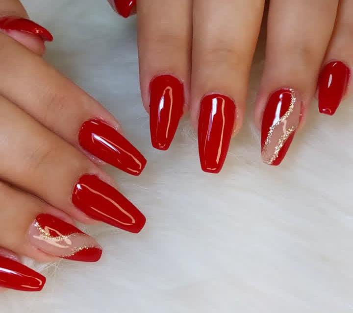 Featuring a rich, glossy red polish with subtle golden line details, this style is timeless and bold—perfect for anyone who loves a chic, confident Christmas look.