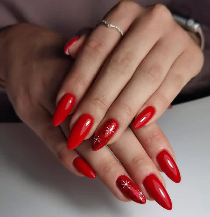This design keeps things simple and bright with pure red nails highlighted by tiny white starbursts, capturing the sparkle and warmth of the holiday, Christmas season.