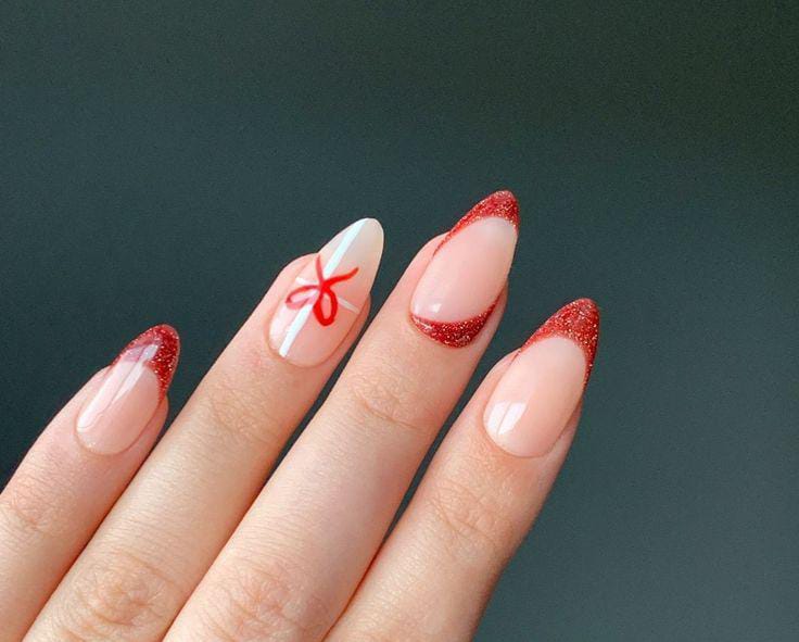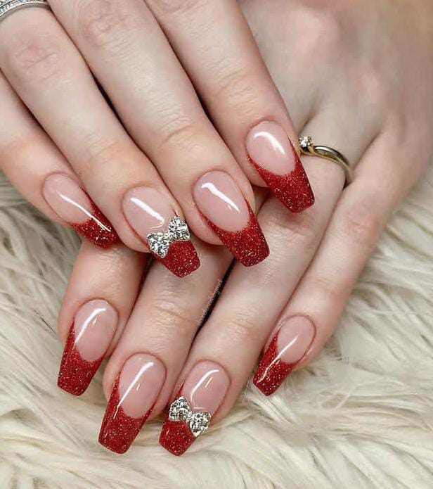 Clear nude nails with glittery red French tips and a tiny red bow design capture a playful, gift-wrapped Christmas feel perfect for the holidays.