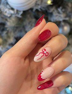 Glossy red nails are paired with nude accents decorated with tiny candy cane patterns, giving a sweet and festive feel that’s both playful and classy Christmas.