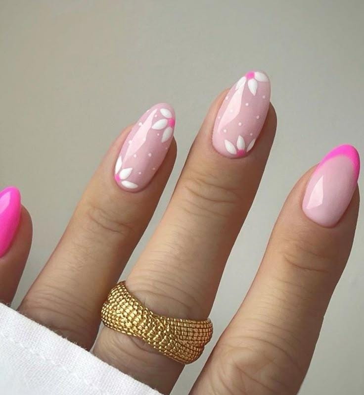 A sheer blush base is paired with hot pink French tips and delicate white floral details for a sweet spring look. It feels feminine, fresh, and effortlessly polished.