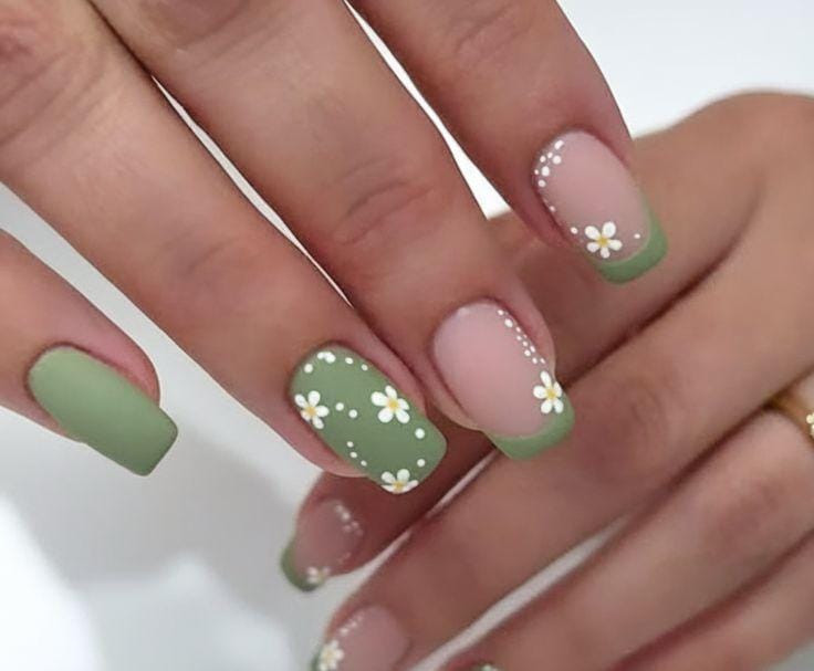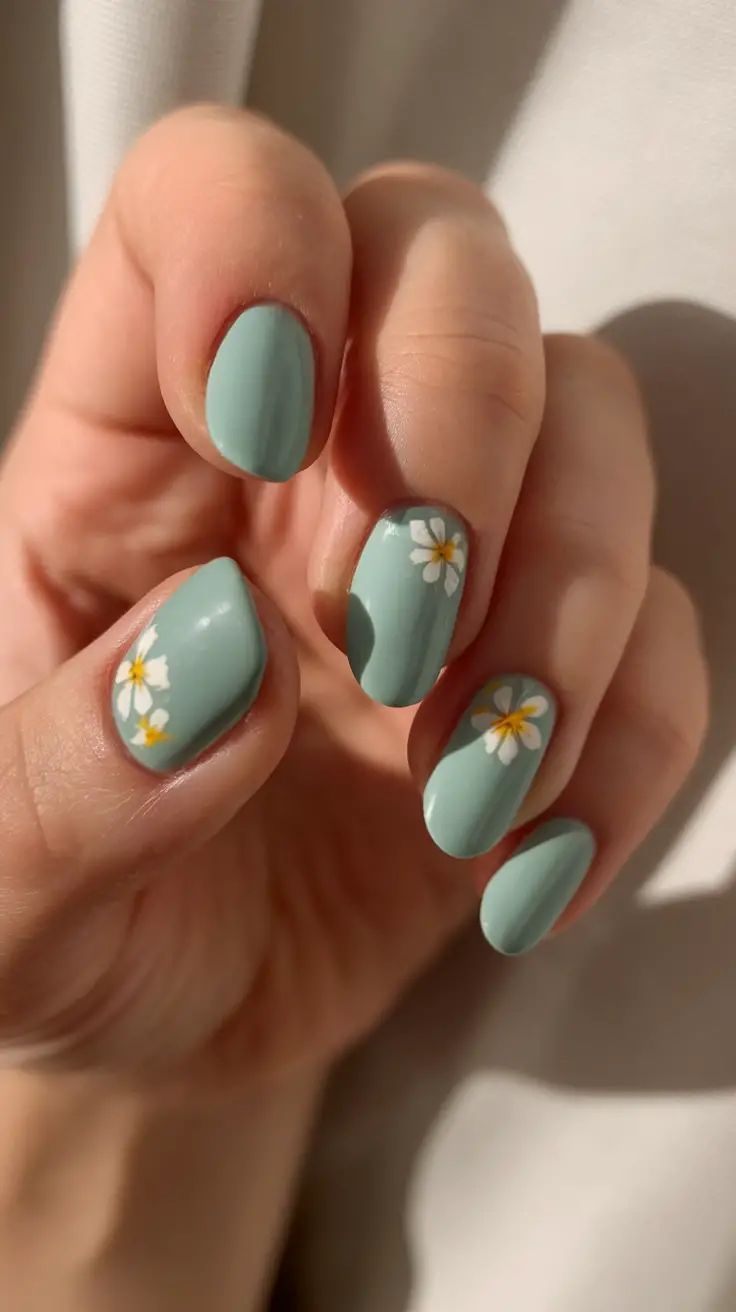 Soft sage green short nails decorated with small white daisy flowers. The style feels calm, nature-inspired, and perfectly fresh for spring.
