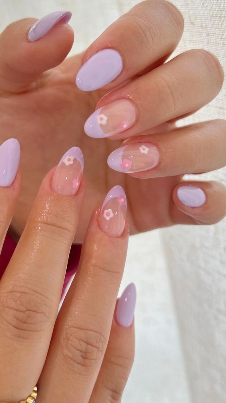 Muted lavender solids mixed with small floral accents on nude nails feel playful yet minimal. This design has a soft spring garden vibe with a clean, polished look.