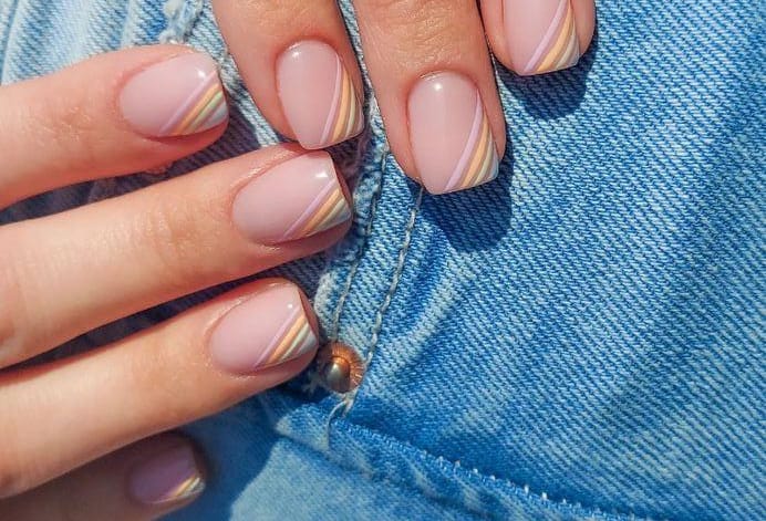 Soft nude nails are finished with thin diagonal pastel lines for a modern twist on a classic look. The design feels light, minimal, and effortlessly spring-ready.
