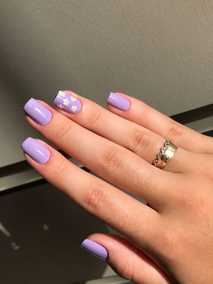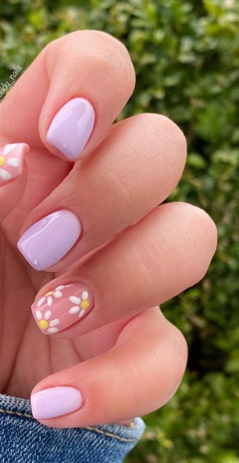 Soft lavender short nails are finished with tiny white daisies for a sweet, airy look. The vibe is fresh, simple, and perfect for early spring days.