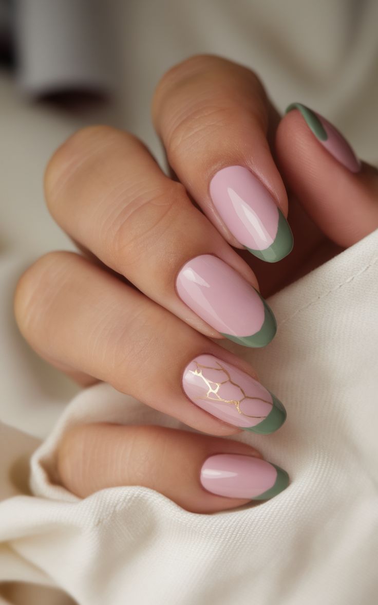 Pale pink nails feature soft green French tips and a delicate gold marble accent. The overall style is elegant, calm, and perfect for spring neutrals.