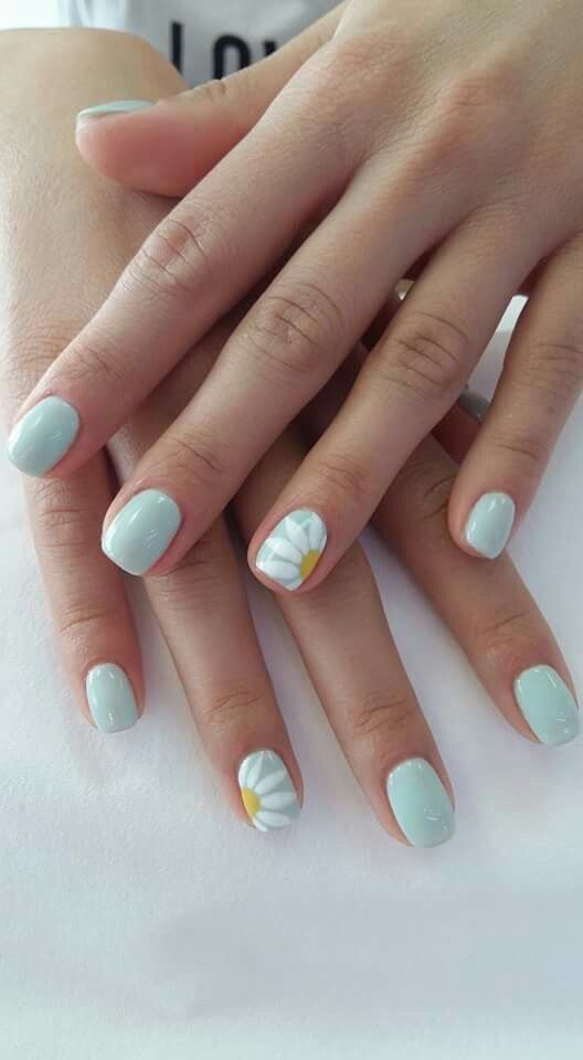Short mint nails are kept simple with small daisy accents for a fresh floral touch. The design feels clean, youthful, and easygoing.