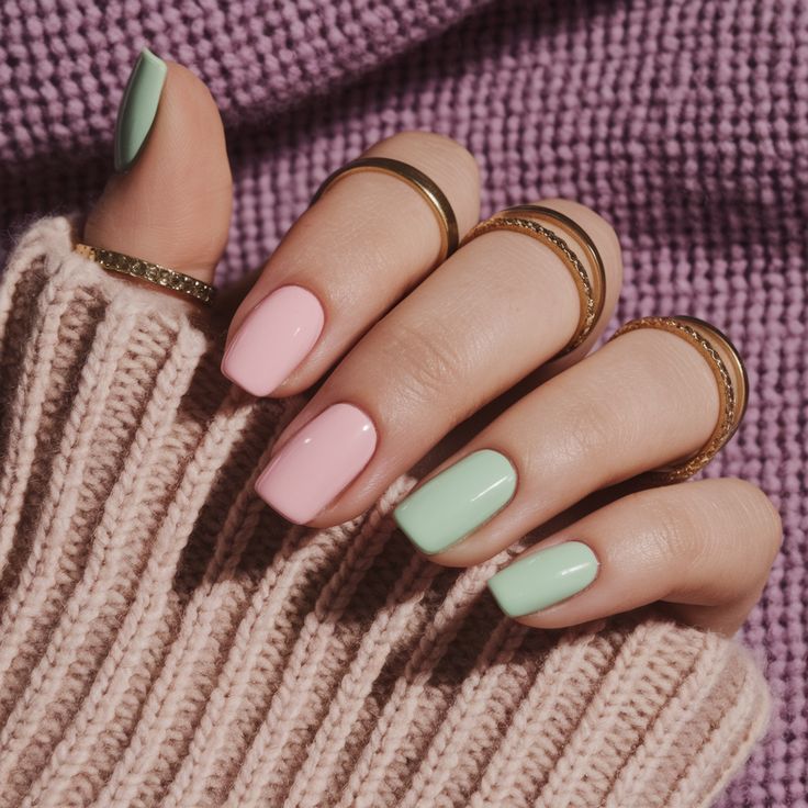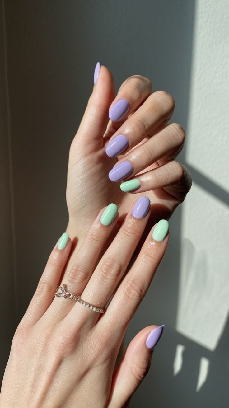 Short nails painted in alternating lavender and mint green shades. The design is playful yet simple, giving off a light and modern spring vibe.