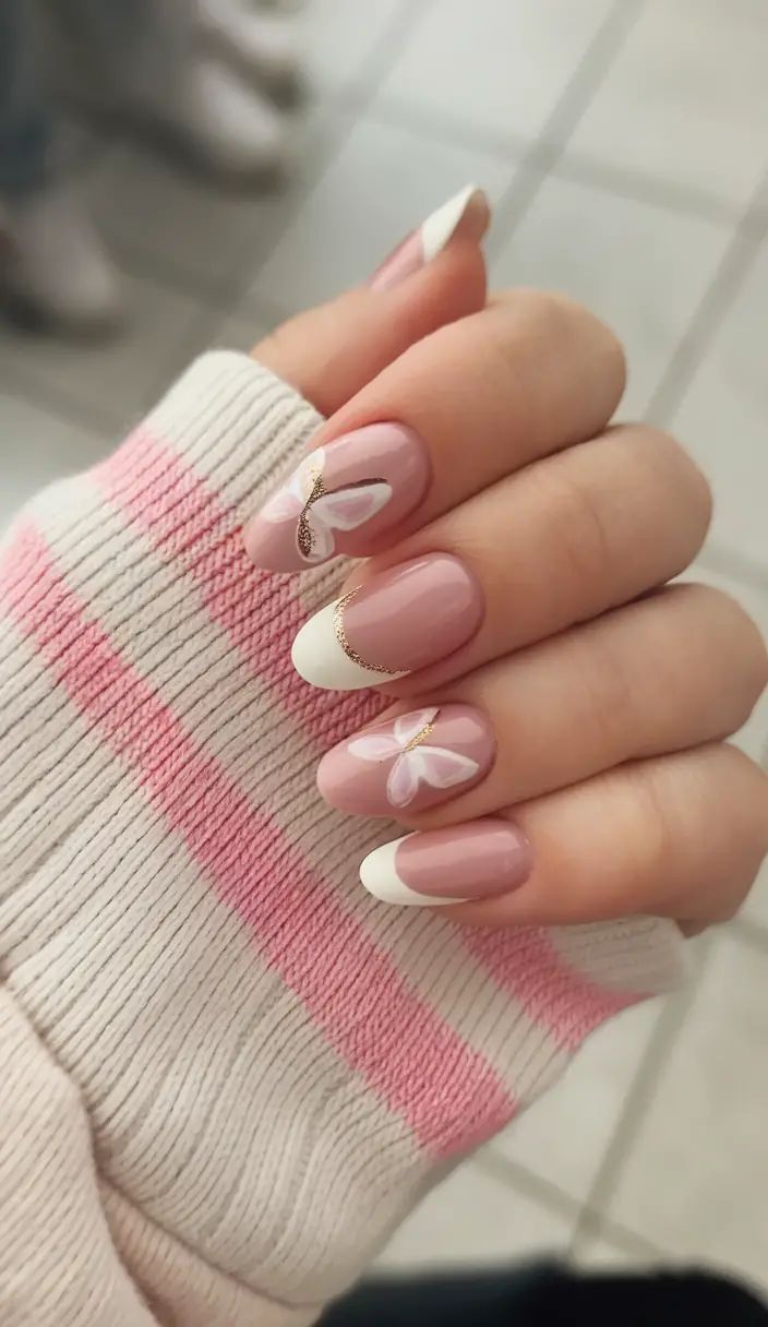 Short blush-pink nails with white French tips and delicate floral accents. The design is elegant, soft, and ideal for a simple spring manicure.