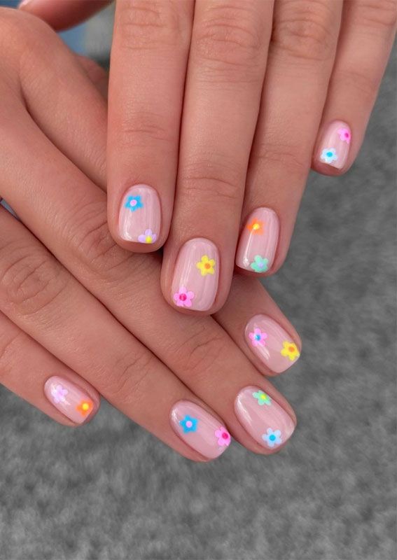 A sheer pink base is decorated with small, colorful flower details scattered across short nails. The vibe is playful, light, and effortlessly spring-ready.
