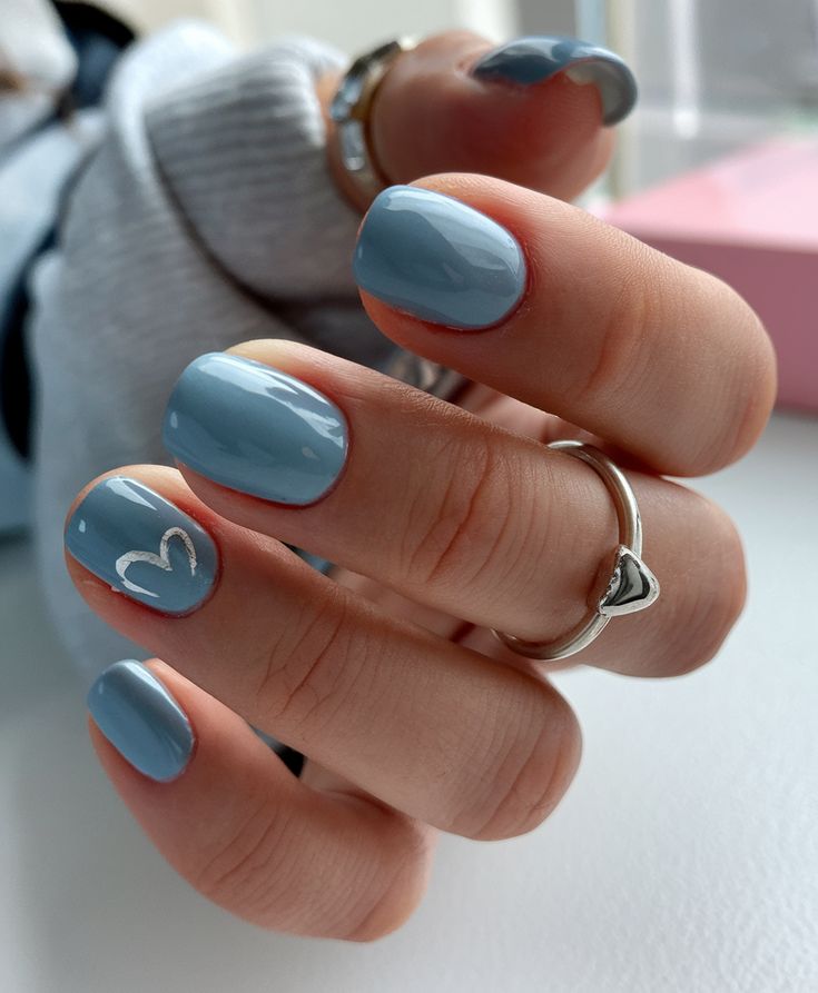 Glossy muted blue nails keep things simple with a tiny white heart accent. The style is calm, modern, and perfect for a minimal spring manicure.