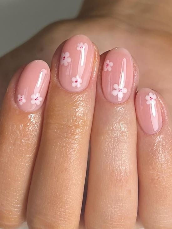 A sheer blush pink base is paired with tiny white floral accents for a barely-there design. It feels elegant, fresh, and effortlessly pretty.