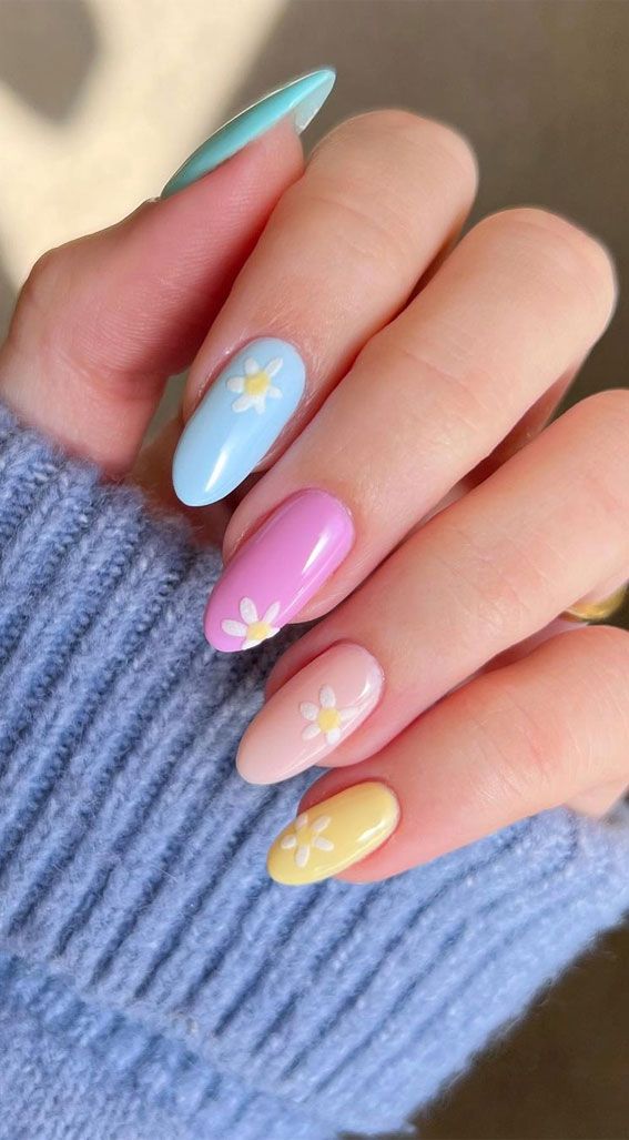 Pastel blue, pink, yellow, and nude tones are combined with simple daisy details for a cheerful finish. The design feels fun, youthful, and full of spring energy.