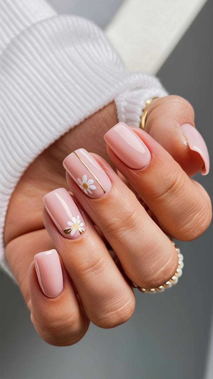 Pale pink short nails are paired with tiny white daisies and subtle gold striping. The design is minimal yet cheerful, giving a polished springtime feel.