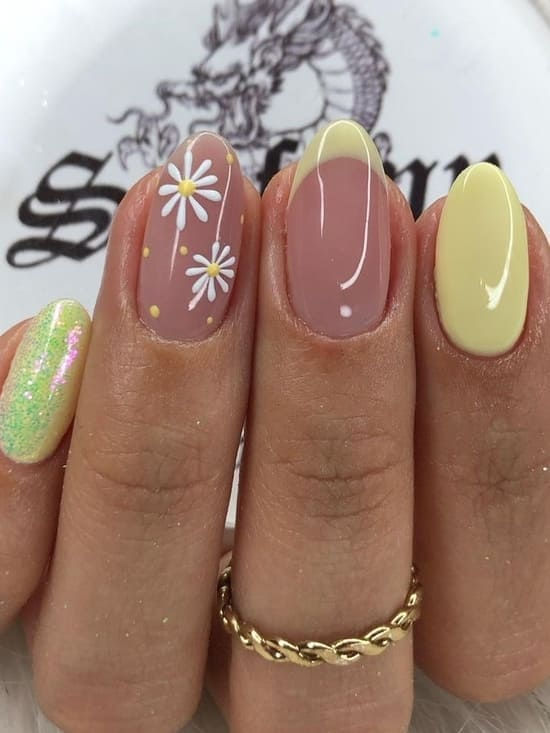Bright yellow nails are paired with soft pink accents covered in tiny white daisies. The look feels cheerful, fresh, and perfect for a sunny spring day.
