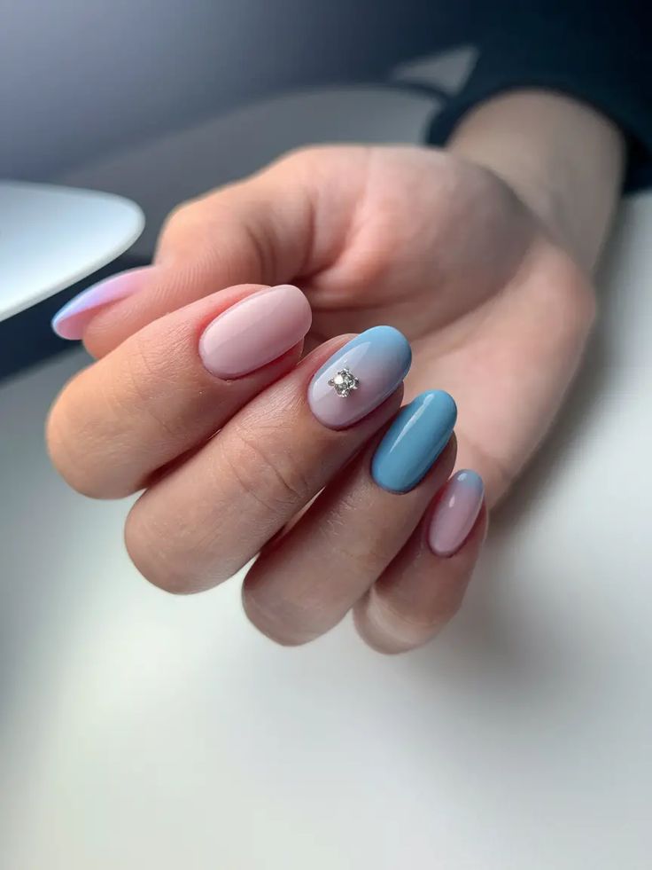 This design features short nails in soft pastel pink and blue tones with a glossy finish and a subtle accent gem. The overall look is clean, feminine, and perfect for a fresh spring vibe.