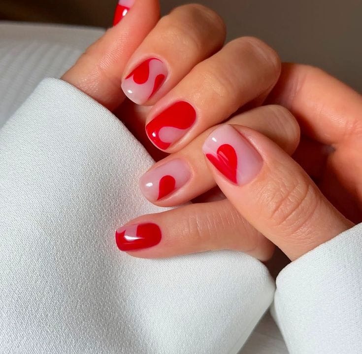 Short nude nails are decorated with bold red heart accents for a simple yet eye-catching design. It feels romantic, playful, and perfect for adding personality without being overdone.