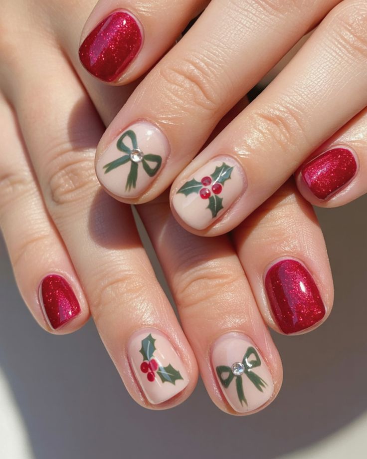 This design combines deep red polish with soft nude accent nails featuring delicate bow and berry artwork. The overall vibe is cozy, charming, and subtly festive while staying simple.