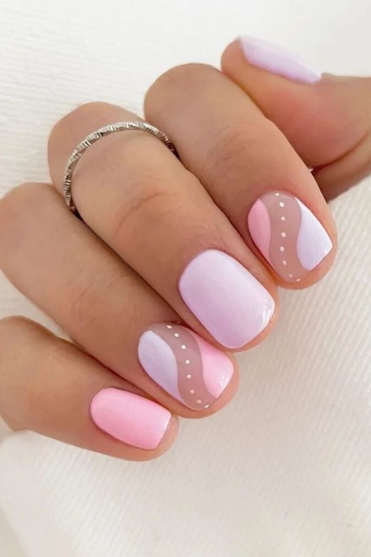 Gentle pink, lilac and nude tones with subtle curved accents and dots create a sweet, understated design. The vibe is soft, elegant, and perfect for short spring nails.